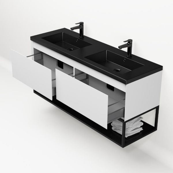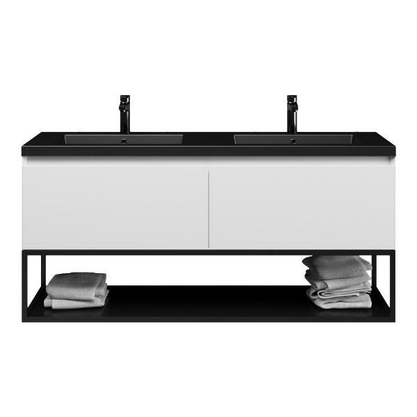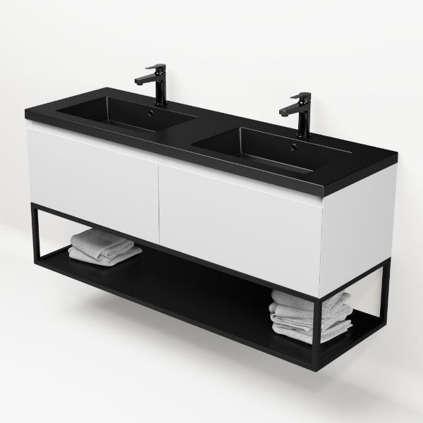 Bellanti Solo/Tela/Esta badmeubel 140x46 2 softclose laden wit mat greeploos polystone wastafel dubbel mar zwart met 2 kraangaten met mat zwart metalen frame