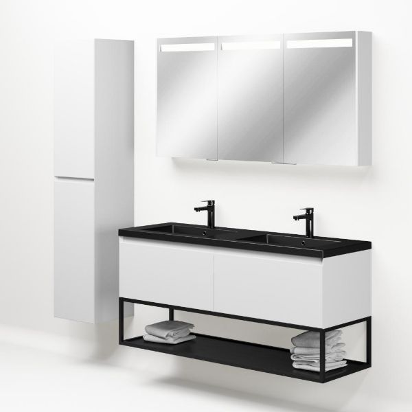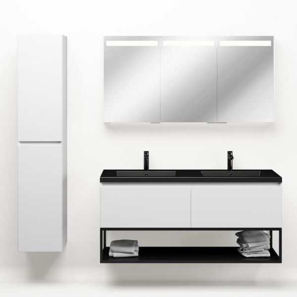 Greeploos badkamermeubel in de kleur wit mat is 140 cm breed.  De wastafel is vervaardig in polystone en heeft de kleur zwart mat. Dit badkamermeubel met deze wastafel is leverbaar tussen de 60 cm t/m 160 cm