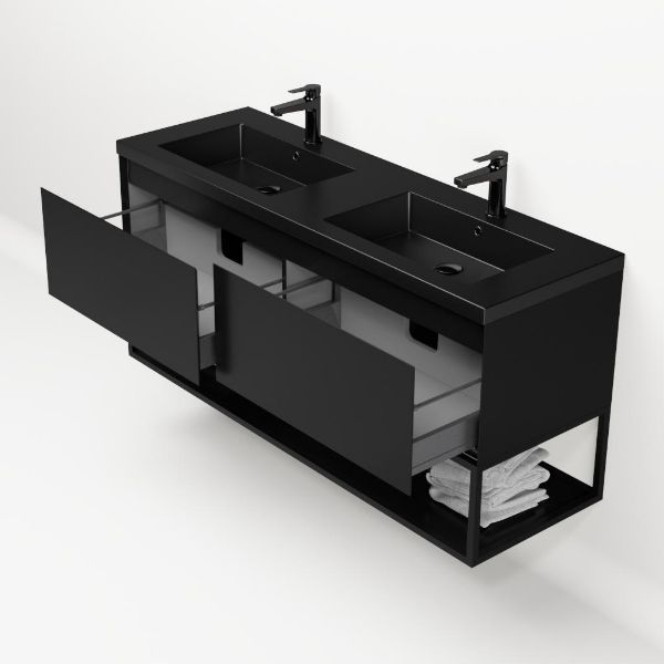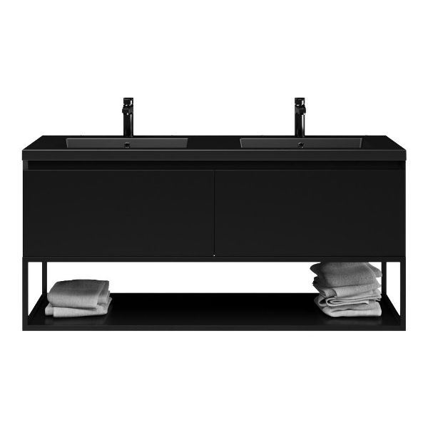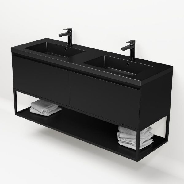 Bellanti Solo/Tela/Esta badmeubel 140x46 2 softclose laden zwart mat greeploos polystone wastafel dubbel mar zwart met 2 kraangaten met mat zwart metalen frame