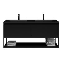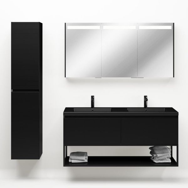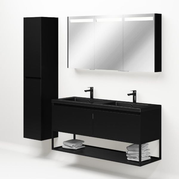 Greeploos badkamermeubel in de kleur zwart mat is 140 cm breed.  De wastafel is vervaardig in polystone en heeft de kleur zwart mat. Dit badkamermeubel met deze wastafel is leverbaar tussen de 60 cm t/m 160 cm