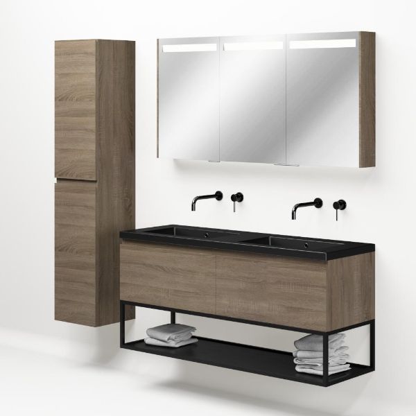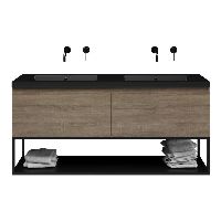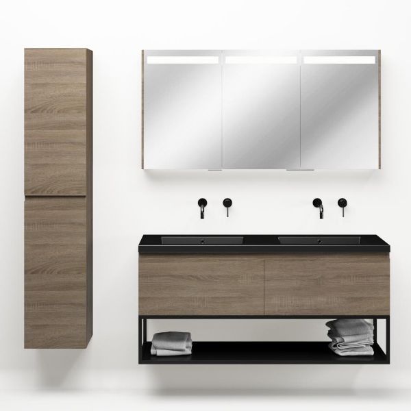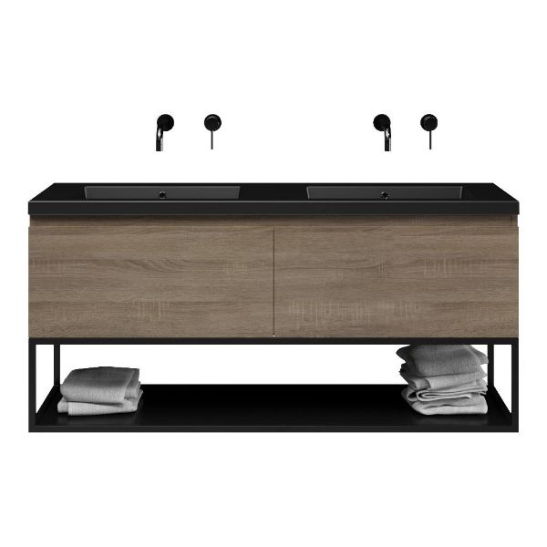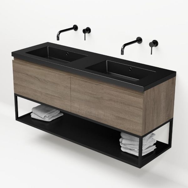 Bellanti Solo/Tela/Esta badmeubel 140x46 2 softclose laden eiken donker greeploos polystone wastafel dubbel zwart mat zonder kraangaten met mat zwart metalen frame