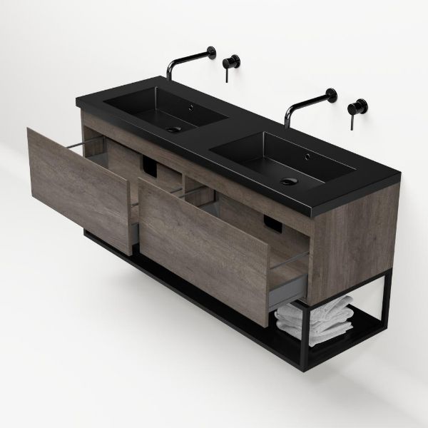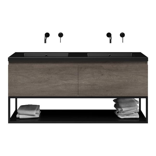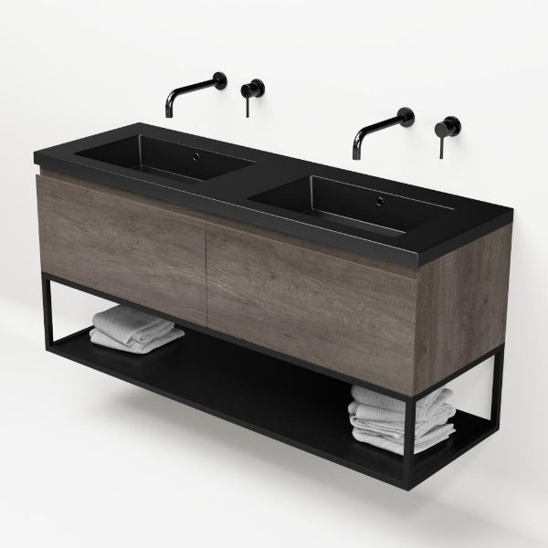 Bellanti Solo/Tela/Esta badmeubel 140x46 2 softclose laden olm donker grijs greeploos polystone wastafel dubbel zwart mat zonder kraangaten met mat zwart metalen frame