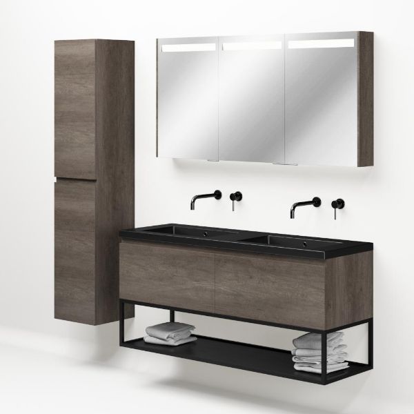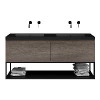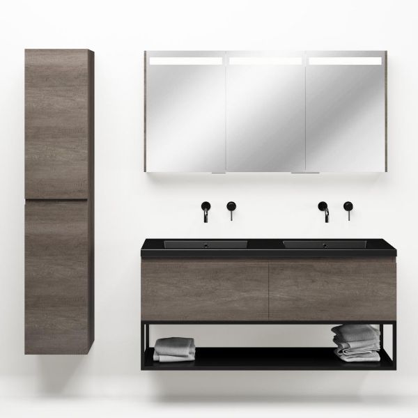 Greeploos badkamermeubel in de kleur olm donker grijs is 140 cm breed.  De wastafel is vervaardig in polystone en heeft de kleur zwart mat. Dit badkamermeubel met deze wastafel is leverbaar tussen de 60 cm t/m 160 cm