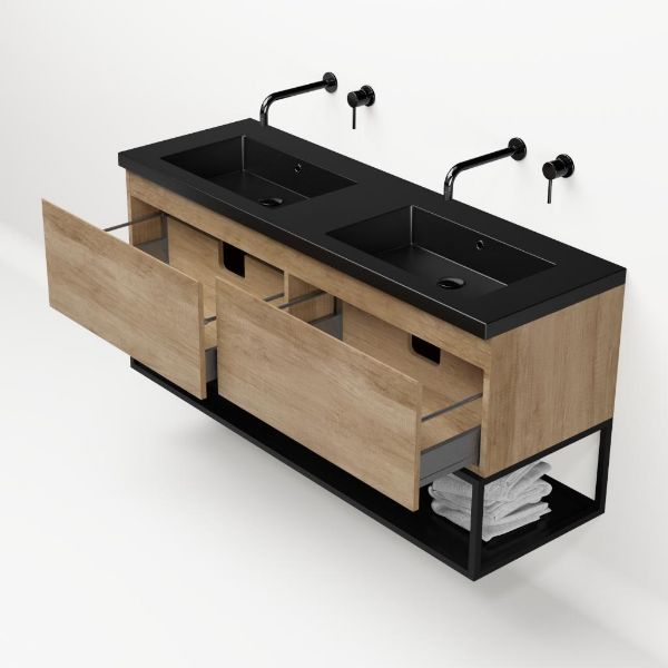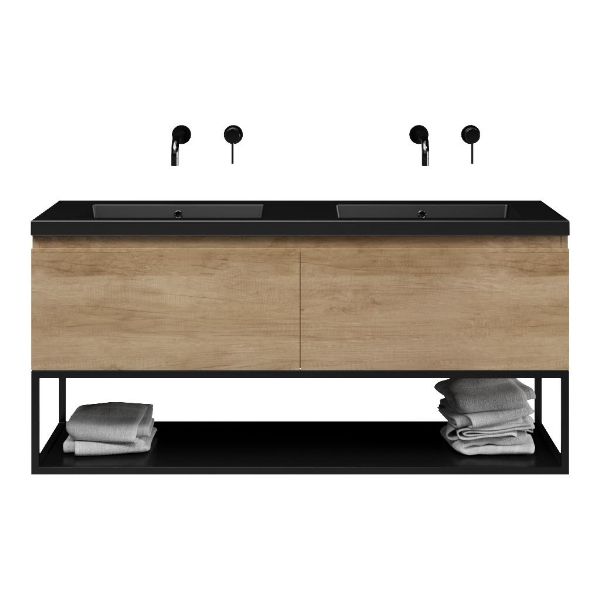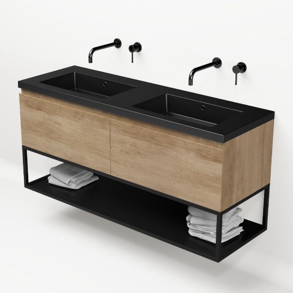 Bellanti Solo/Tela/Esta badmeubel 140x46 2 softclose laden olm greeploos polystone wastafel dubbel zwart mat zonder kraangaten met mat zwart metalen frame
