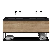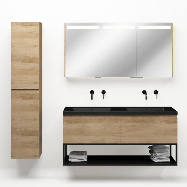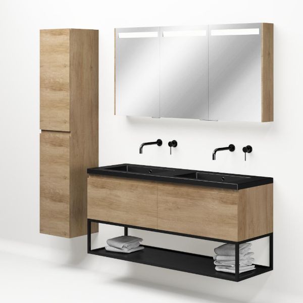 Greeploos badkamermeubel in de kleur olm is 140 cm breed.  De wastafel is vervaardig in polystone en heeft de kleur zwart mat. Dit badkamermeubel met deze wastafel is leverbaar tussen de 60 cm t/m 160 cm