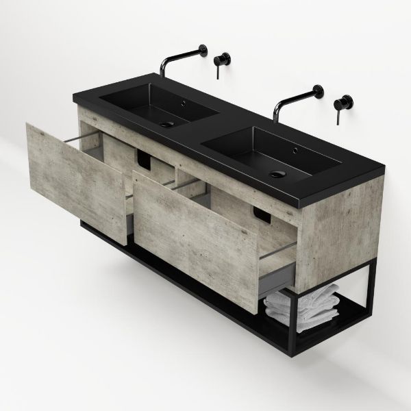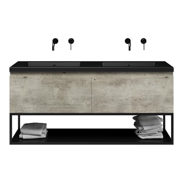 | | Bellanti Solo/Tela/Esta badmeubel 140x46 2 softclose laden steigerhout look grijs greeploos polystone wastafel dubbel zwart mat zonder kraangaten met mat zwart metalen frame |
