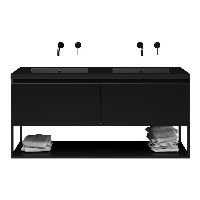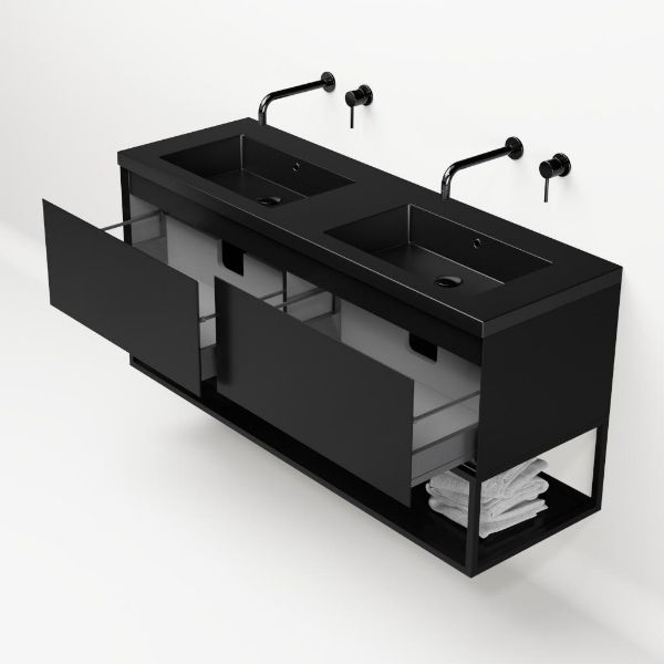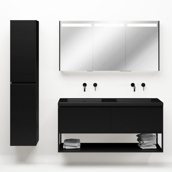 Greeploos badkamermeubel in de kleur zwart mat is 140 cm breed.  De wastafel is vervaardig in polystone en heeft de kleur zwart mat. Dit badkamermeubel met deze wastafel is leverbaar tussen de 60 cm t/m 160 cm