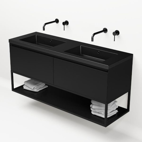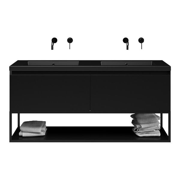 Bellanti Solo/Tela/Esta badmeubel 140x46 2 softclose laden zwart mat greeploos polystone wastafel dubbel zwart mat zonder kraangaten met mat zwart metalen frame
