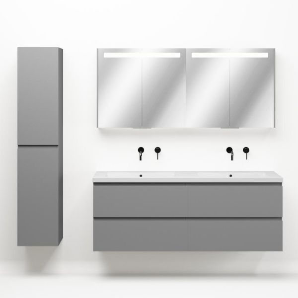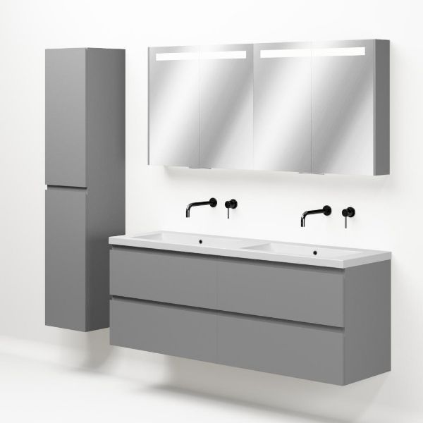Greeploos badkamermeubel in de kleur licht grijs mat is 160 cm breed. De wastafel is vervaardig in quartz en heeft de kleur wit mat. Dit badkamermeubel met deze wastafel is leverbaar tussen de 60 cm t/m 200 cm
