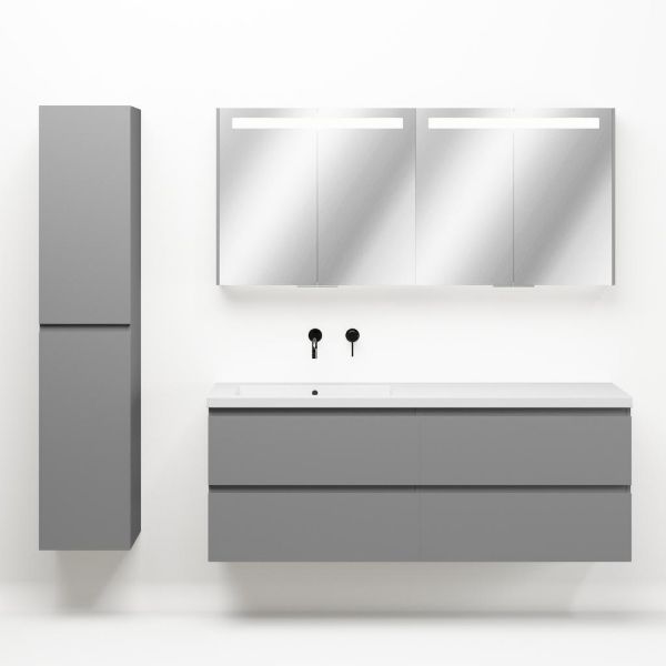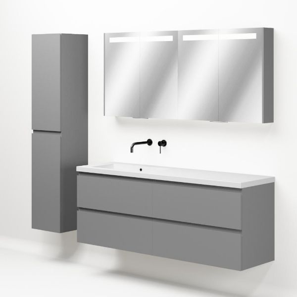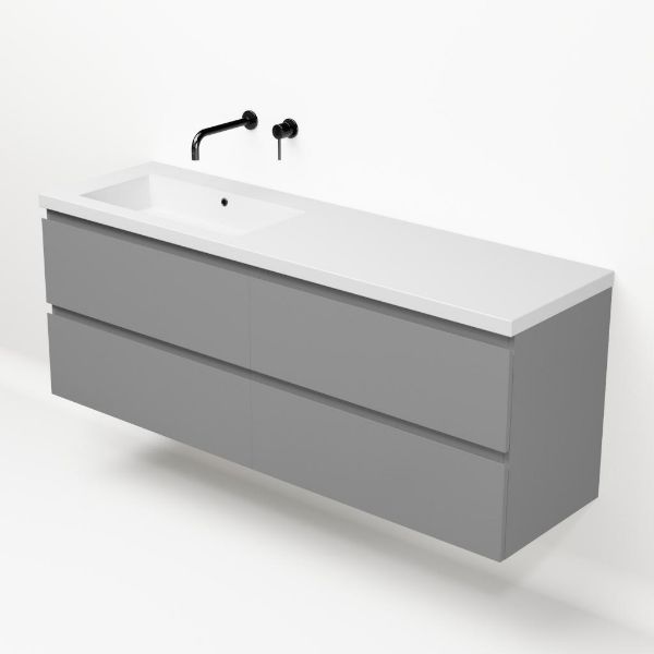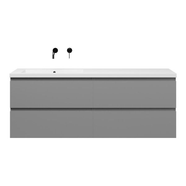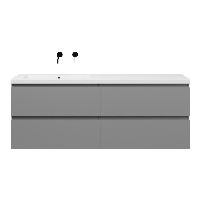 Greeploos badkamermeubel in de kleur licht grijs mat is 160 cm breed.  De wastafel is vervaardig in polystone en heeft de kleur wit glans. Dit badkamermeubel met deze wastafel is leverbaar tussen de 60 cm t/m 200 cm