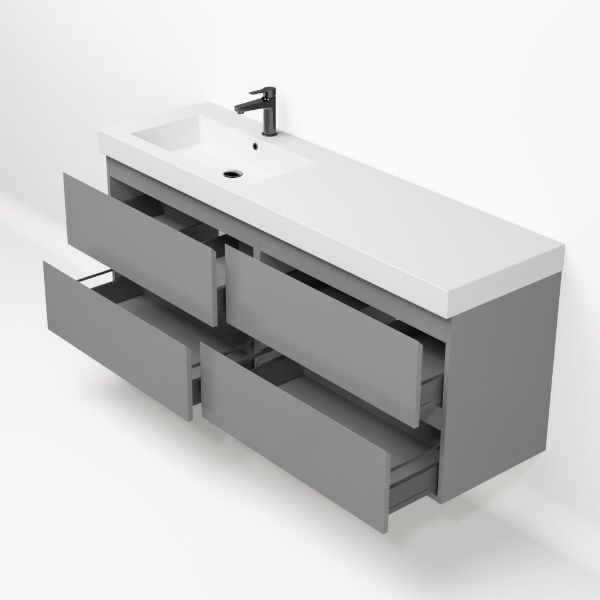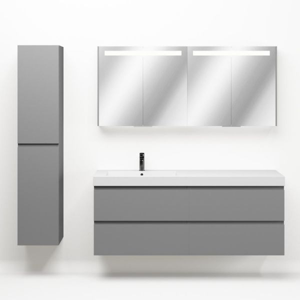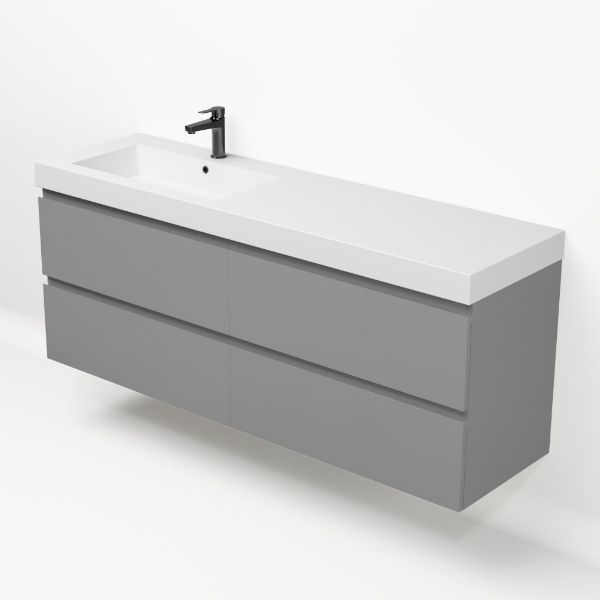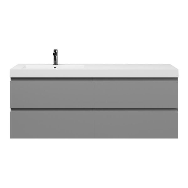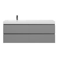 Greeploos badkamermeubel in de kleur licht grijs mat is 160 cm breed.  De wastafel is vervaardig in polystone en heeft de kleur wit glans. Dit badkamermeubel met deze wastafel is leverbaar tussen de 60 cm t/m 200 cm