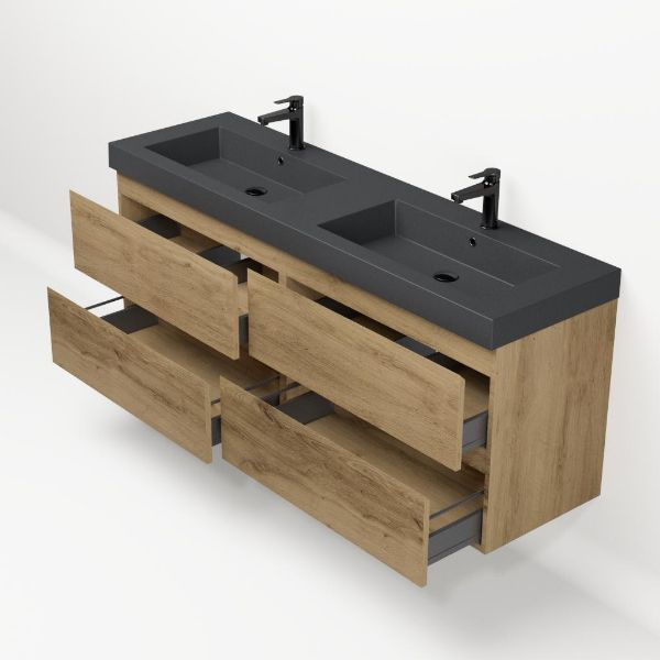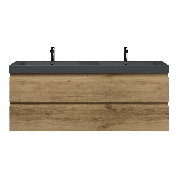 Bellanti Gisella/Esta-Q badmeubel 160x46 4 softclose laden warm eiken greeploos polystone dubbele wastafel mat grijs met 2 kraangaten