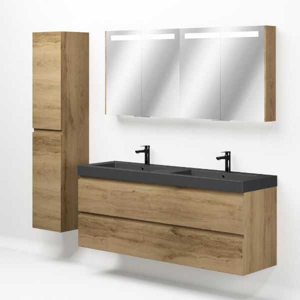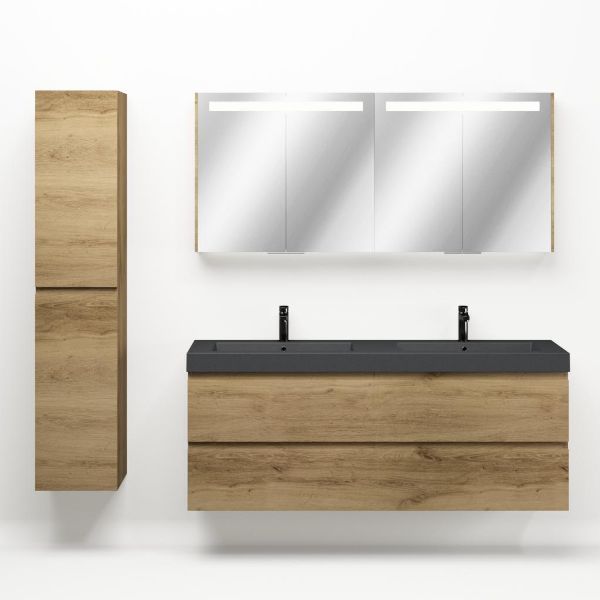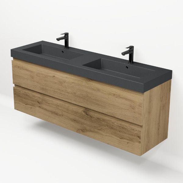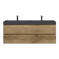 Greeploos badkamermeubel in de kleur eiken warm is 160 cm breed.  De wastafel is vervaardig in quartz en heeft de kleur grijs mat. Dit badkamermeubel met deze wastafel is leverbaar tussen de 60 cm t/m 200 cm