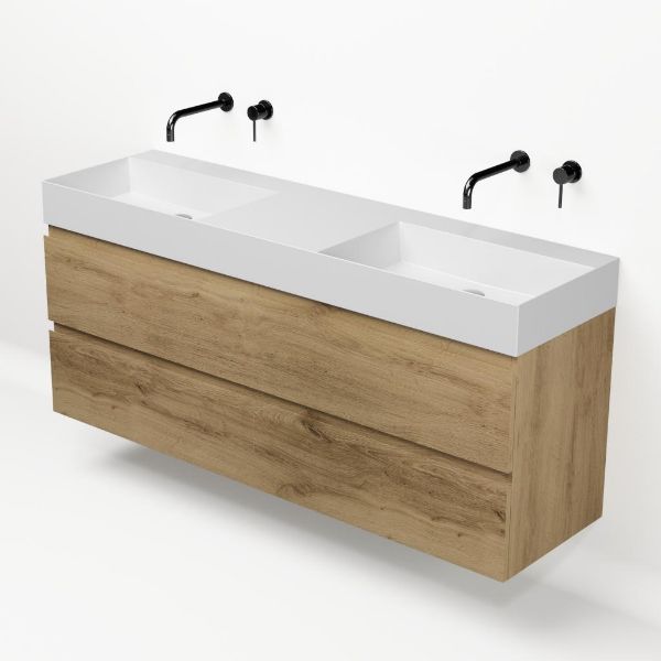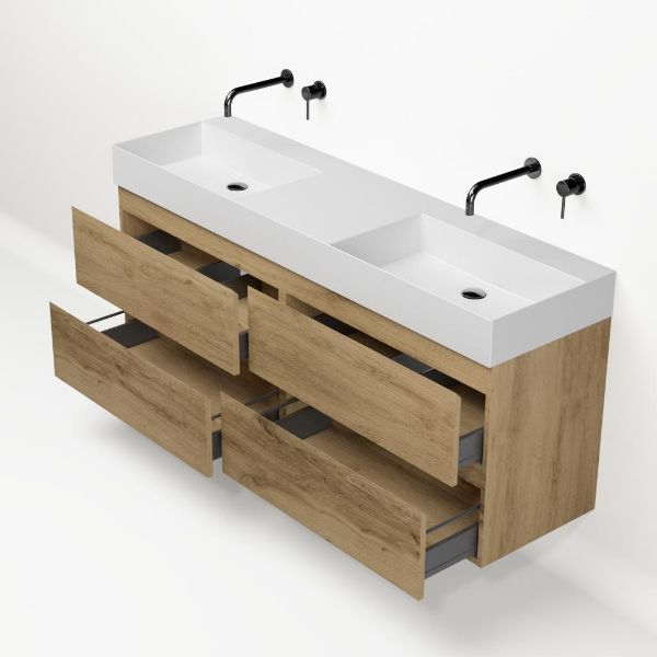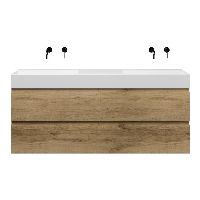 | | Bellanti Gisella/Azzurra badmeubel 160x46 4 softclose laden warm eiken greeploos keramiek dubbele wastafel mat wit zonder kraangaten |