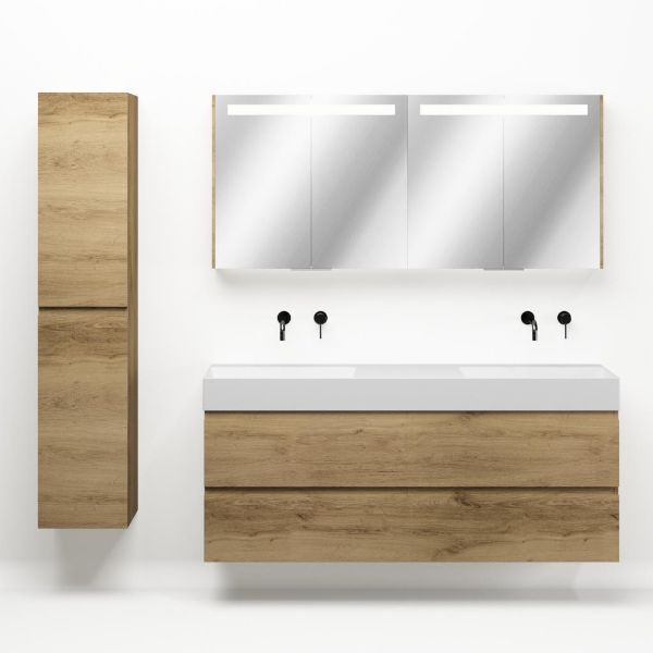 Greeploos badkamermeubel in de kleur eiken warm is 160 cm breed. De wastafel is vervaardig in keramiek en heeft de kleur wit mat. Dit badkamermeubel met deze wastafel is leverbaar tussen de 60 cm t/m 160 cm