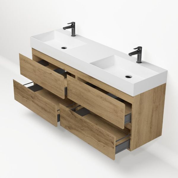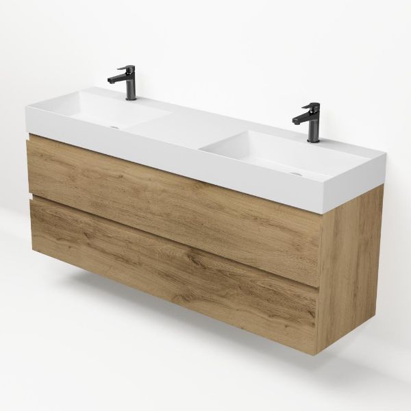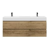 | | Bellanti Gisella/Azzurra badmeubel 160x46 4 softclose laden warm eiken greeploos keramiek dubbele wastafel wit met 2 kraangaten |
