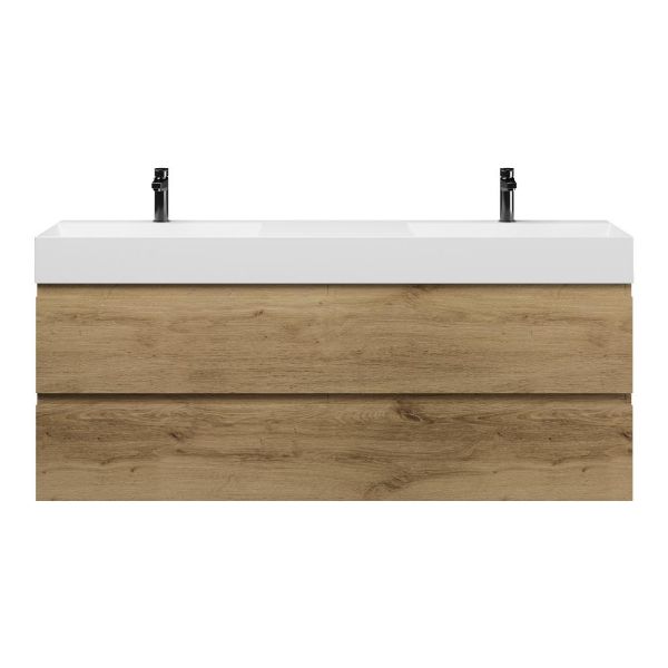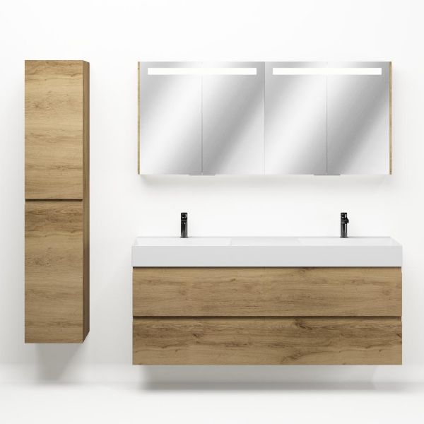 Greeploos badkamermeubel in de kleur eiken warm is 160 cm breed. De wastafel is vervaardig in keramiek en heeft de kleur wit glans. Dit badkamermeubel met deze wastafel is leverbaar tussen de 60 cm t/m 160 cm