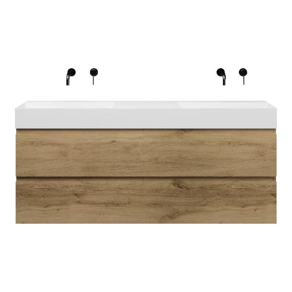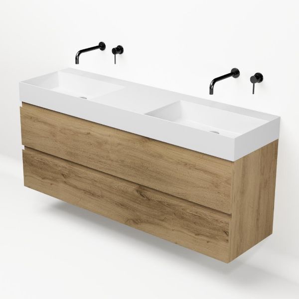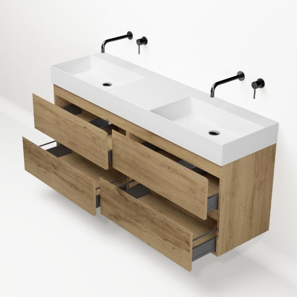 | | Bellanti Gisella/Azzurra badmeubel 160x46 4 softclose laden warm eiken greeploos keramiek dubbele wastafel wit zonder kraangaten |