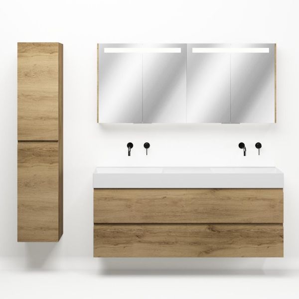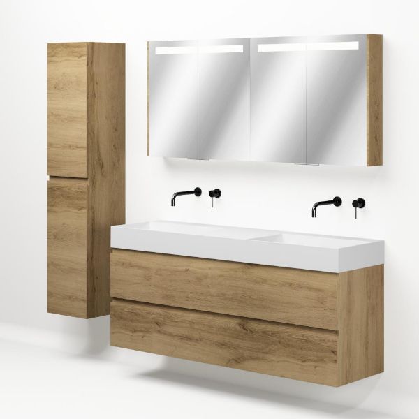 Greeploos badkamermeubel in de kleur eiken warm is 160 cm breed. De wastafel is vervaardig in keramiek en heeft de kleur wit glans. Dit badkamermeubel met deze wastafel is leverbaar tussen de 60 cm t/m 160 cm