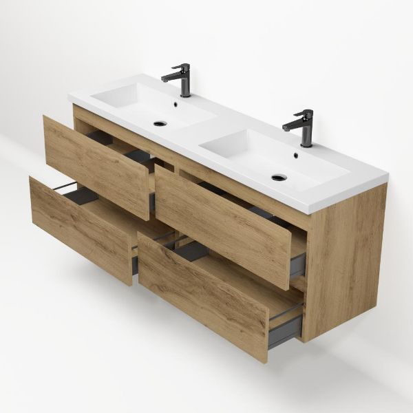 Bellanti Gisella/Esta badmeubel 160x46 4 softclose laden warm eiken greeploos polystone dubbele wastafel wit met 2 kraangaten