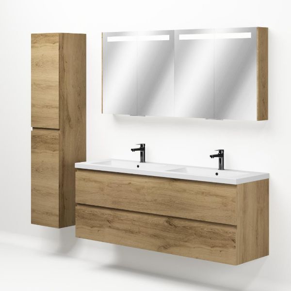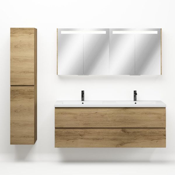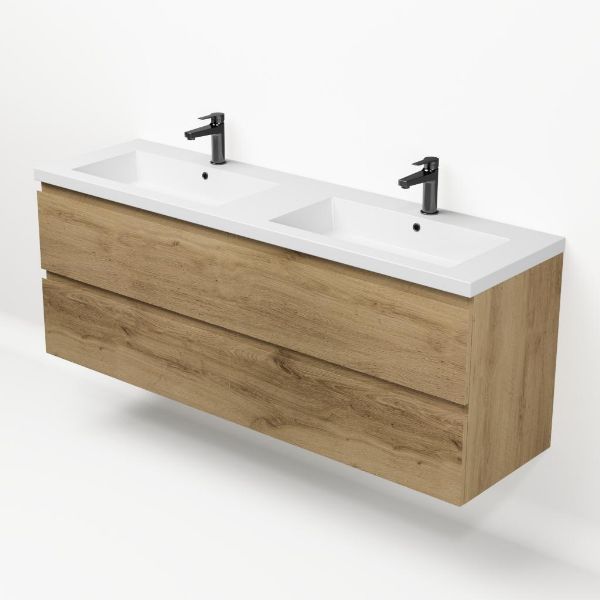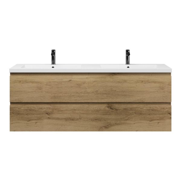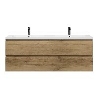 Greeploos badkamermeubel in de kleur eiken warm is 160 cm breed.  De wastafel is vervaardig in polystone en heeft de kleur wit glans. Dit badkamermeubel met deze wastafel is leverbaar tussen de 60 cm t/m 200 cm