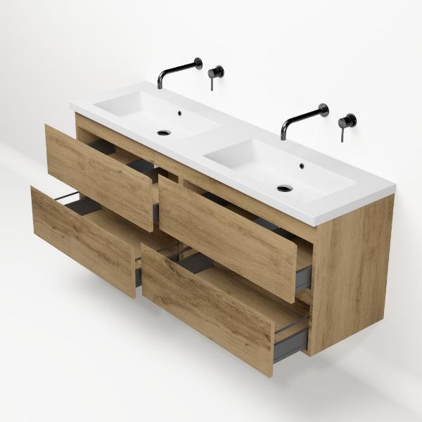 Bellanti Gisella/Esta badmeubel 160x46 4 softclose laden warm eiken greeploos polystone dubbele wastafel wit zonder kraangaten
