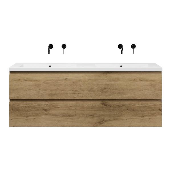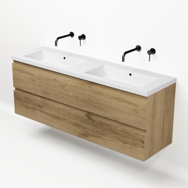 Greeploos badkamermeubel in de kleur eiken warm is 160 cm breed.  De wastafel is vervaardig in polystone en heeft de kleur wit glans. Dit badkamermeubel met deze wastafel is leverbaar tussen de 60 cm t/m 200 cm