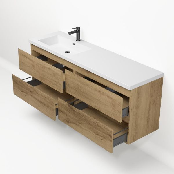 Bellanti Gisella/Esta badmeubel 160x46 4 softclose laden warm eiken greeploos polystone enkele wastafel links wit met 1 kraangat