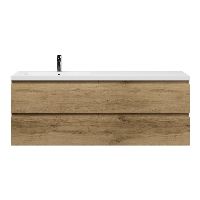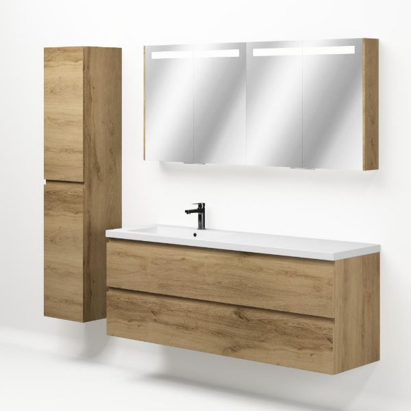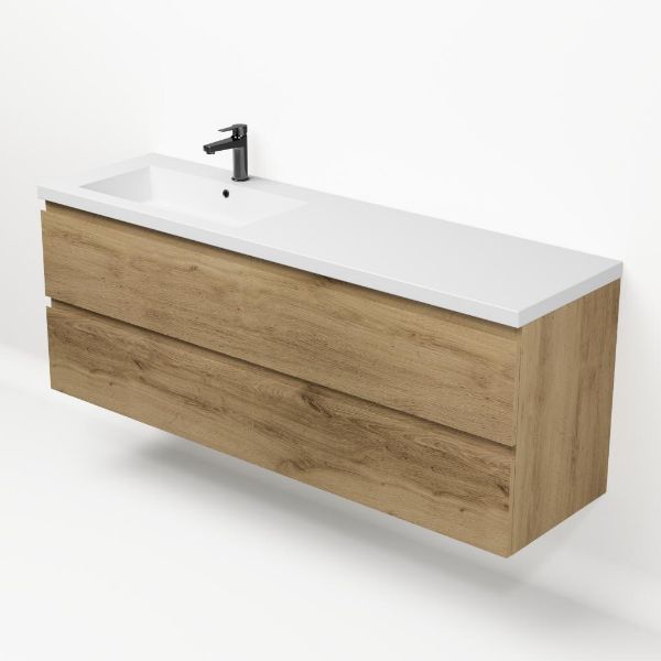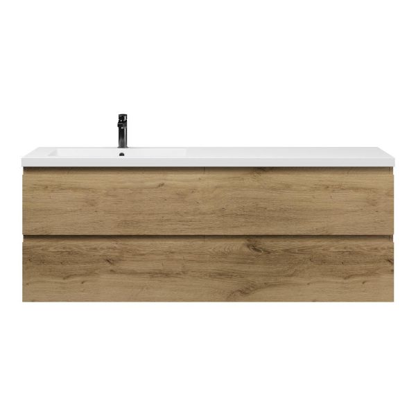 Greeploos badkamermeubel in de kleur eiken warm is 160 cm breed.  De wastafel is vervaardig in polystone en heeft de kleur wit glans. Dit badkamermeubel met deze wastafel is leverbaar tussen de 60 cm t/m 200 cm