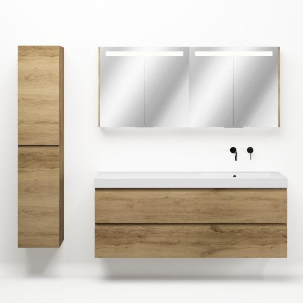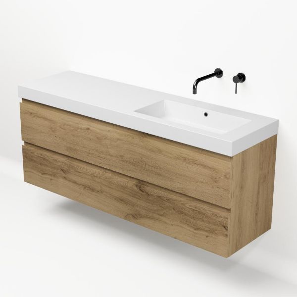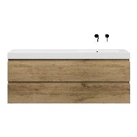 Greeploos badkamermeubel in de kleur eiken warm is 160 cm breed.  De wastafel is vervaardig in polystone en heeft de kleur wit glans. Dit badkamermeubel met deze wastafel is leverbaar tussen de 60 cm t/m 200 cm