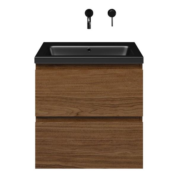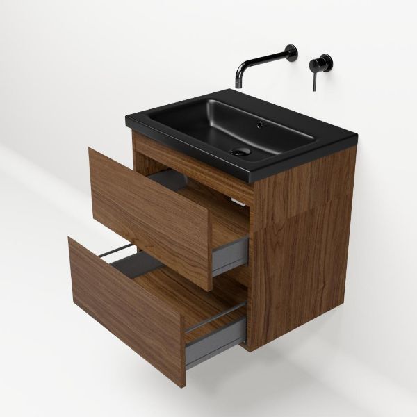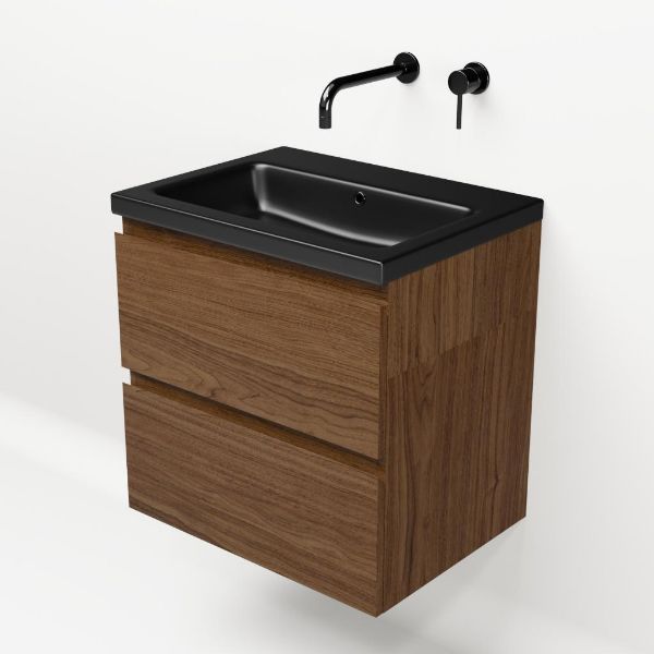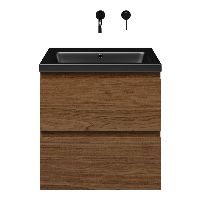 Bellanti Elena/Amelia badmeubel 60x46 2 softclose laden warm noten greeploos keramische wastafel zwart mat zonder kraangaten