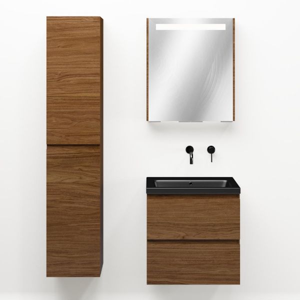 Greeploos badkamermeubel in de kleur warm noten is 60 cm breed.  De wastafel is vervaardig in keramiek en heeft de kleur zwart mat. Dit badkamermeubel met deze wastafel is leverbaar tussen de 60 cm t/m 120 cm