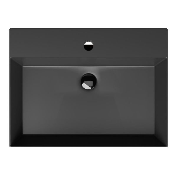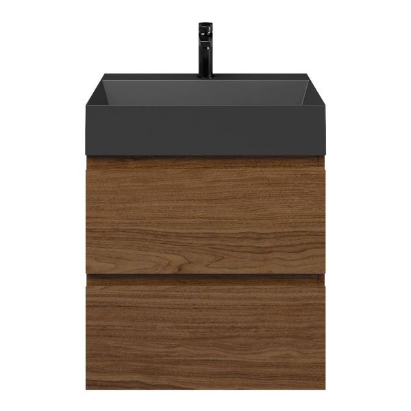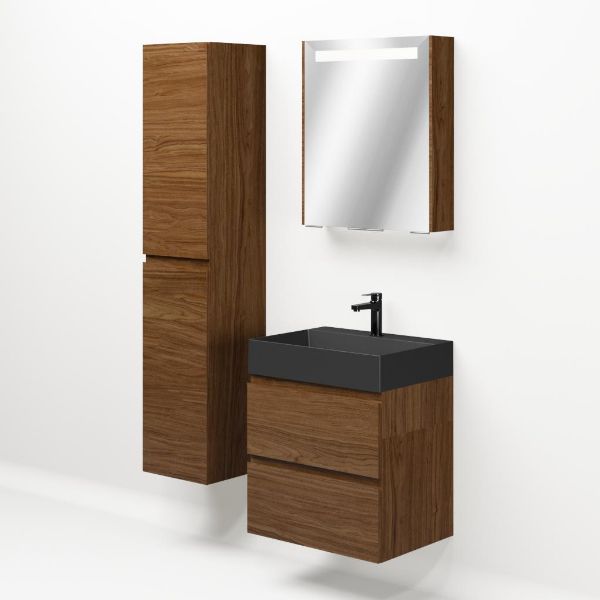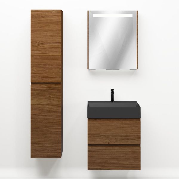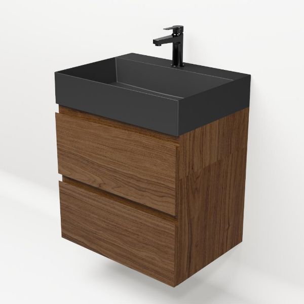 Greeploos badkamermeubel in de kleur warm noten is 60 cm breed.  De wastafel is vervaardig in keramiek en heeft de kleur zwart mat. Dit badkamermeubel met deze wastafel is leverbaar tussen de 60 cm t/m 120 cm