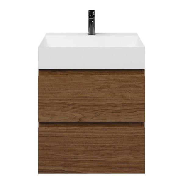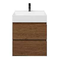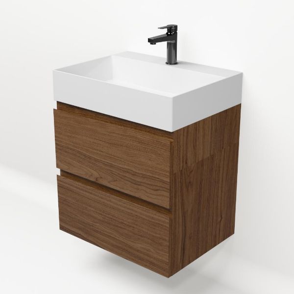 Greeploos badkamermeubel in de kleur warm noten is 60 cm breed.  De wastafel is vervaardig in keramiek en heeft de kleur wit glans. Dit badkamermeubel met deze wastafel is leverbaar tussen de 60 cm t/m 120 cm