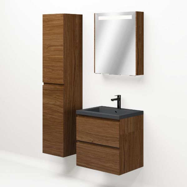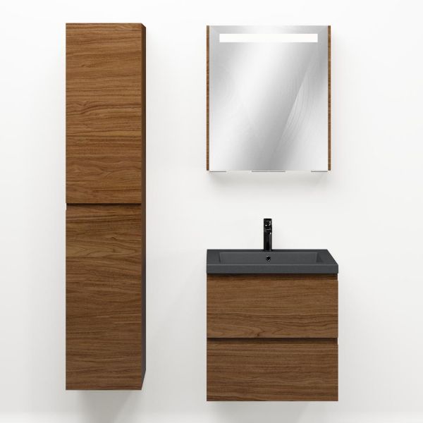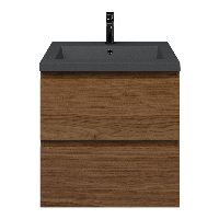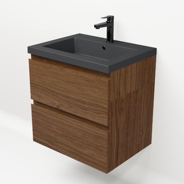 Greeploos badkamermeubel in de kleur warm noten is 60 cm breed.  De wastafel is vervaardig in quartz en heeft de kleur grijs mat. Dit badkamermeubel met deze wastafel is leverbaar tussen de 60 cm t/m 200 cm