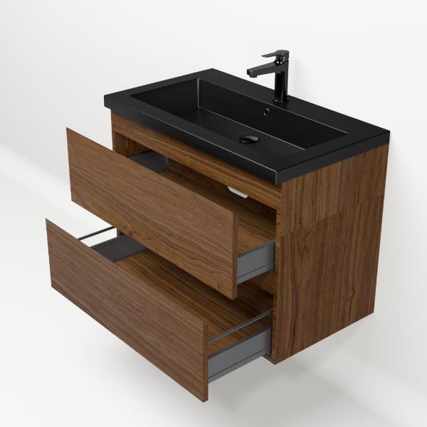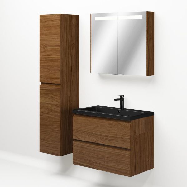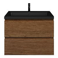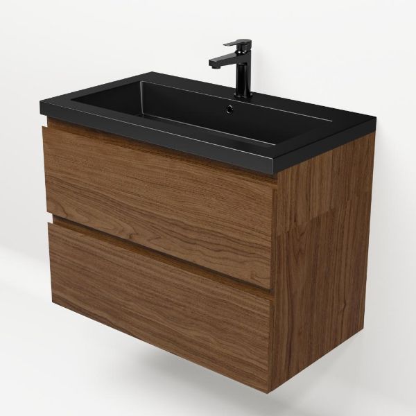 Greeploos badkamermeubel in de kleur warm noten is 80 cm breed.  De wastafel is vervaardig in polystone en heeft de kleur zwart mat. Dit badkamermeubel met deze wastafel is leverbaar tussen de 60 cm t/m 200 cm