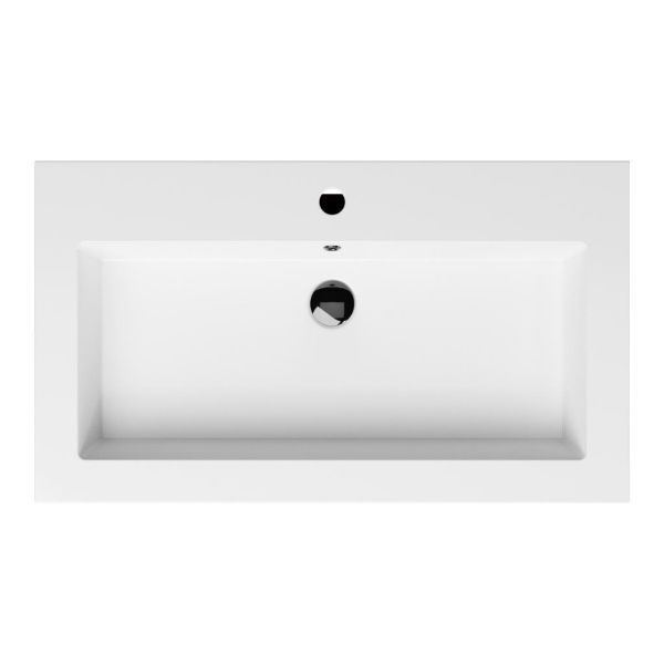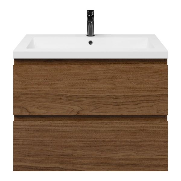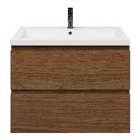 Greeploos badkamermeubel in de kleur warm noten is 80 cm breed.  De wastafel is vervaardig in polystone en heeft de kleur wit glans. Dit badkamermeubel met deze wastafel is leverbaar tussen de 60 cm t/m 200 cm
