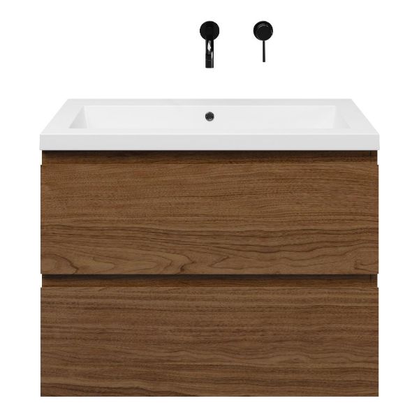 Greeploos badkamermeubel in de kleur warm noten is 80 cm breed.  De wastafel is vervaardig in polystone en heeft de kleur wit glans. Dit badkamermeubel met deze wastafel is leverbaar tussen de 60 cm t/m 200 cm