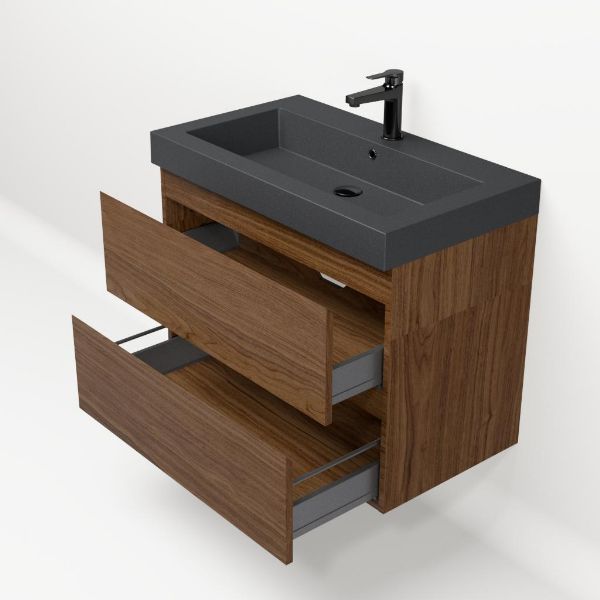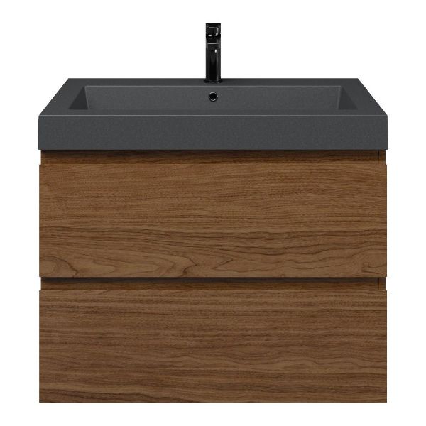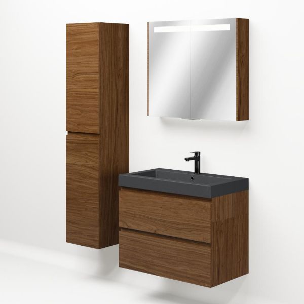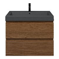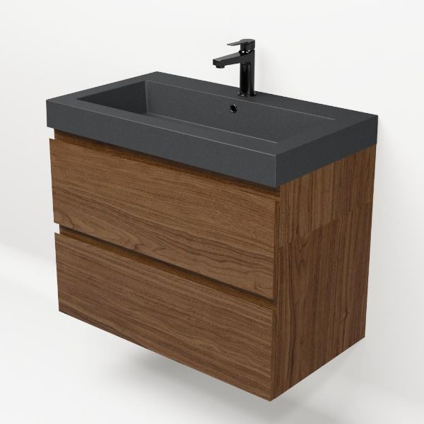 Greeploos badkamermeubel in de kleur warm noten is 80 cm breed.  De wastafel is vervaardig in quartz en heeft de kleur grijs mat. Dit badkamermeubel met deze wastafel is leverbaar tussen de 60 cm t/m 200 cm