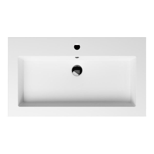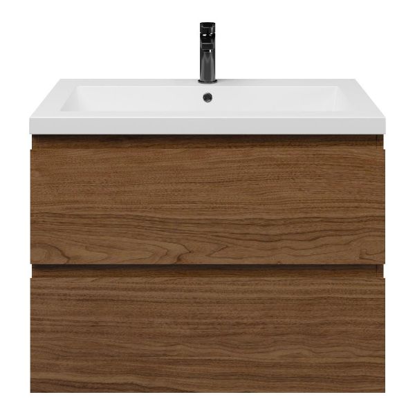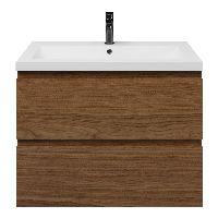 Greeploos badkamermeubel in de kleur warm noten is 80 cm breed.  De wastafel is vervaardig in polystone en heeft de kleur wit mat. Dit badkamermeubel met deze wastafel is leverbaar tussen de 60 cm t/m 200 cm