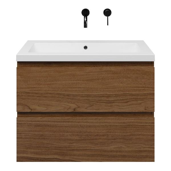 Greeploos badkamermeubel in de kleur warm noten is 80 cm breed.  De wastafel is vervaardig in quartz en heeft de kleur wit mat. Dit badkamermeubel met deze wastafel is leverbaar tussen de 60 cm t/m 200 cm