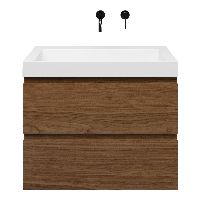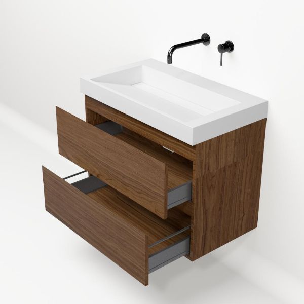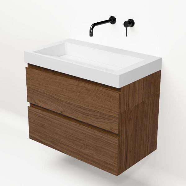 Greeploos badkamermeubel in de kleur warm noten is 80 cm breed.  De wastafel is vervaardig in polystone en heeft de kleur wit glans. Dit badkamermeubel met deze wastafel is leverbaar tussen de 60 cm t/m 200 cm