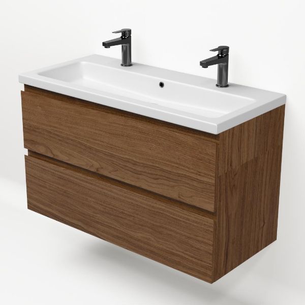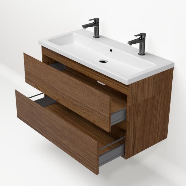 Bellanti Elena/Amelia badmeubel 100x46 2 softclose laden warm noten greeploos keramische wastafel wit mat met 2 kraangaten