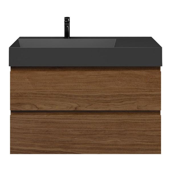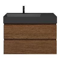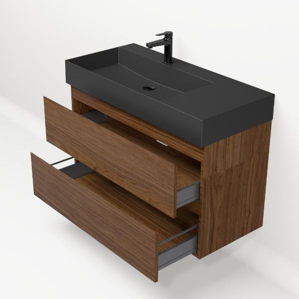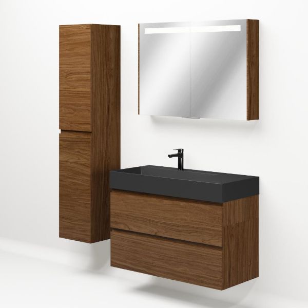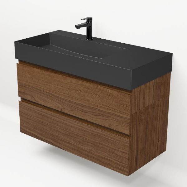 Greeploos badkamermeubel in de kleur warm noten is 100 cm breed.  De wastafel is vervaardig in keramiek en heeft de kleur zwart mat. Dit badkamermeubel met deze wastafel is leverbaar tussen de 60 cm t/m 120 cm