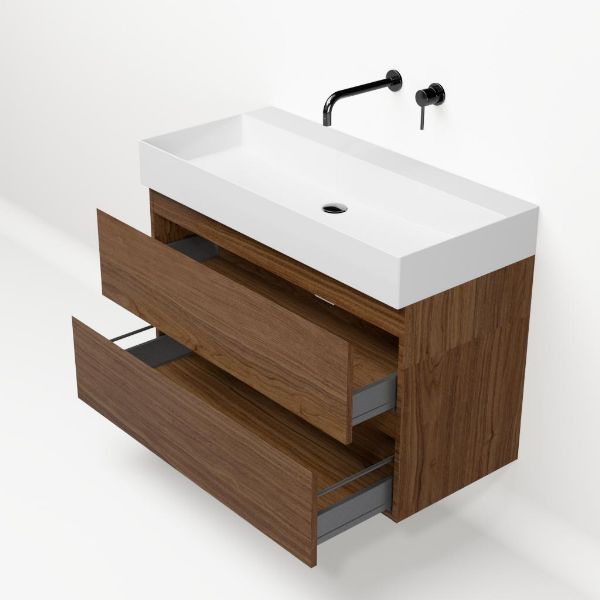 Bellanti Elena/Azzurra badmeubel 100x46 2 softclose laden warm noten greeploos keramische wastafel wit glans zonder kraangaten