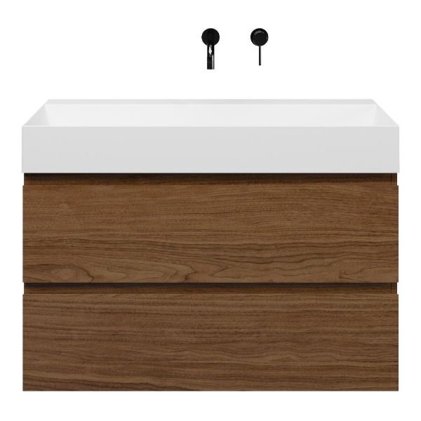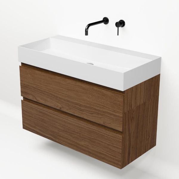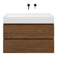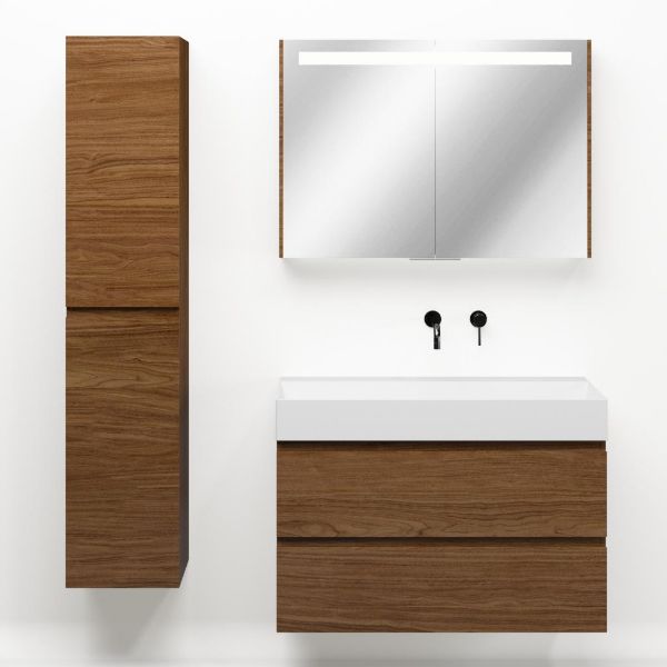 Greeploos badkamermeubel in de kleur warm noten is 100 cm breed.  De wastafel is vervaardig in keramiek en heeft de kleur wit glans. Dit badkamermeubel met deze wastafel is leverbaar tussen de 60 cm t/m 120 cm
