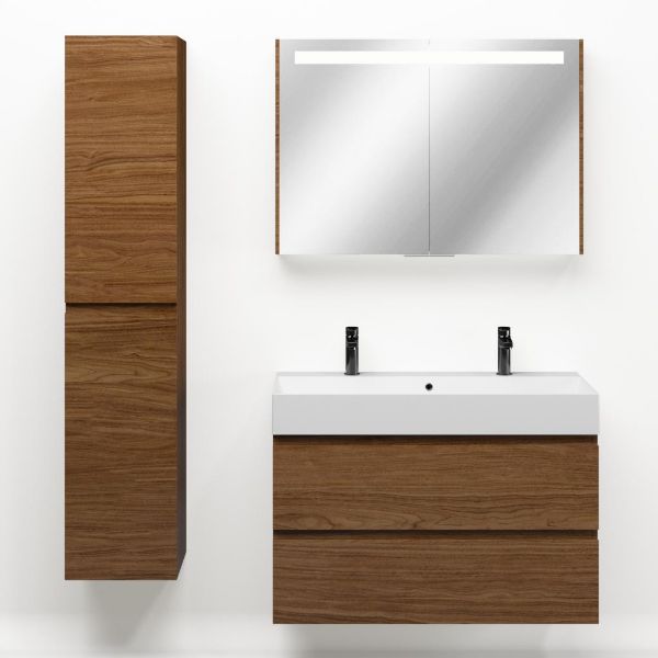 Greeploos badkamermeubel in de kleur warm noten is 100 cm breed.  De wastafel is vervaardig in keramiek en heeft de kleur wit mat. Dit badkamermeubel met deze wastafel is leverbaar tussen de 60 cm t/m 120 cm