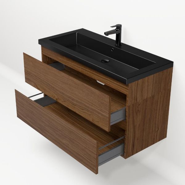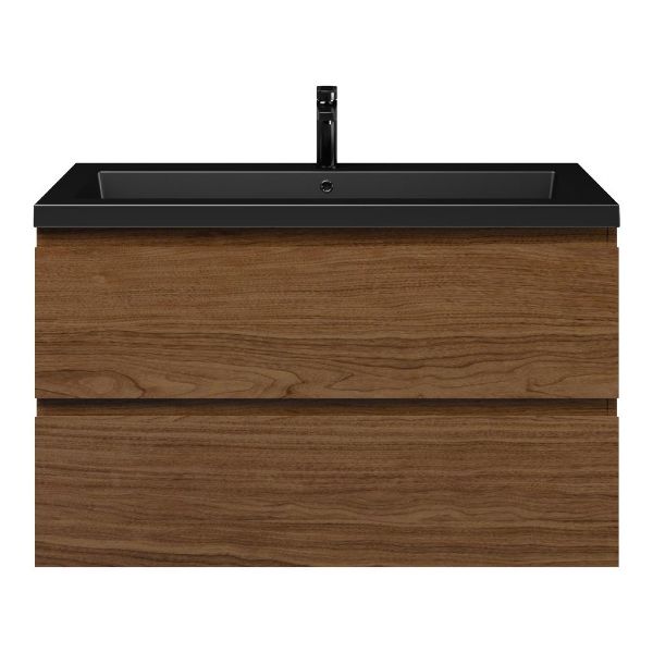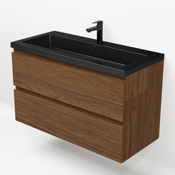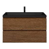 Greeploos badkamermeubel in de kleur warm noten is 100 cm breed.  De wastafel is vervaardig in polystone en heeft de kleur zwart mat. Dit badkamermeubel met deze wastafel is leverbaar tussen de 60 cm t/m 200 cm