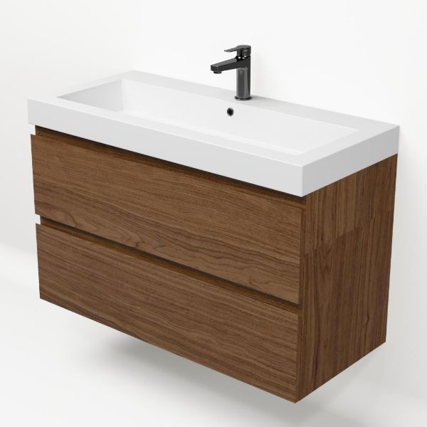 Greeploos badkamermeubel in de kleur warm noten is 100 cm breed.  De wastafel is vervaardig in polystone en heeft de kleur wit glans. Dit badkamermeubel met deze wastafel is leverbaar tussen de 60 cm t/m 200 cm