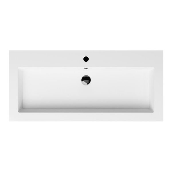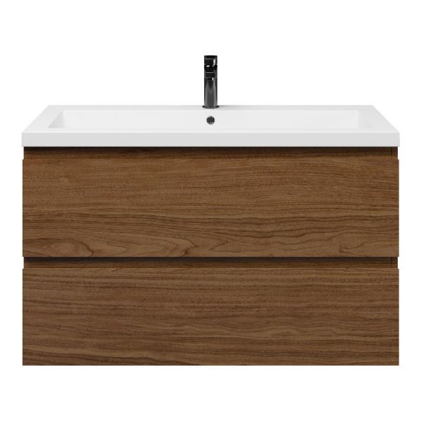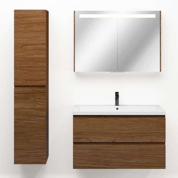 Greeploos badkamermeubel in de kleur warm noten is 100 cm breed.  De wastafel is vervaardig in polystone en heeft de kleur wit glans. Dit badkamermeubel met deze wastafel is leverbaar tussen de 60 cm t/m 200 cm